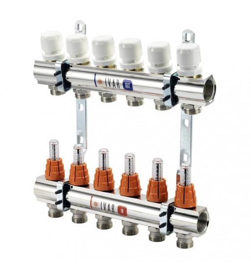 Set distribuitoare tip bară de inox cu debitmetre și ventile termostatice. Distribuitoare de tur și retur, execuție din inox AISI 304 cu ieșiri dispuse decalat, piese de capăt, robinete de golire, aerisitoare și un set de suporți de susținere a distribuitoarelor pentru montajul pe perete sau în cutii metalice.