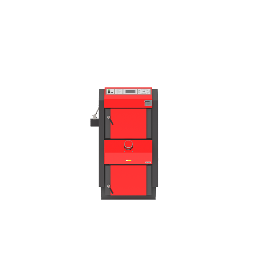 Partea frontală a corpului cazanului este prevăzută (sus) cu uşă de încărcare combustibil şi (jos) cu uşă de curăţare a camerei de ardere secundară de cenuşă. De asemenea, în partea frontală superioară se află mânerul de acţionare al clapetei de aprindere.