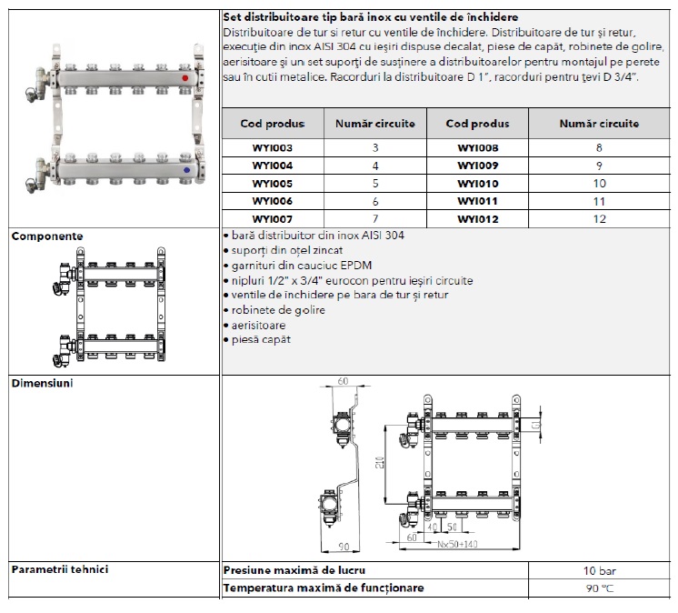 Distribuitoare de tur și retur, execuție din inox AISI 304 cu ieșiri dispuse decalat, piese de capăt, robinete de golire, aerisitoare și un set suporți de susținere a distribuitoarelor pentru montajul pe perete sau în cutii metalice.