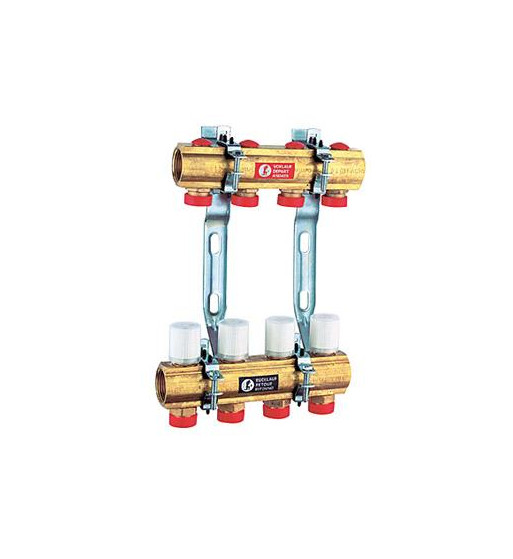 Distribuitoare de tur și retur, execuție din inox AISI 304 cu ieșiri dispuse decalat, piese de capăt, robinete de golire, aerisitoare și un set suporți de susținere a distribuitoarelor pentru montajul pe perete sau în cutii metalice.