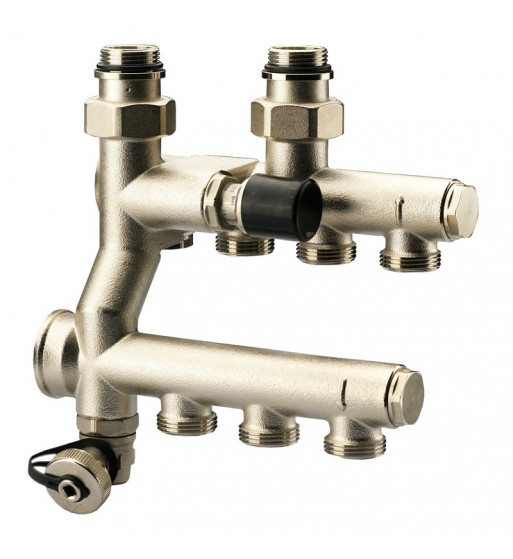 Set distribuitoare tip bară de inox cu debitmetre și ventile termostatice. Distribuitoare de tur și retur, execuție din inox AISI 304 cu ieșiri dispuse decalat, piese de capăt, robinete de golire, aerisitoare și un set de suporți de susținere a distribuitoarelor pentru montajul pe perete sau în cutii metalice.
