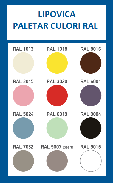 Culoarea standard este alb, RAL 9016, dar exista o paleta larga de culori Lipovica din care se poate alege cea care este convenabila.
