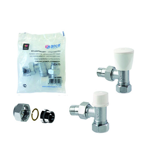 Setul de robineți ARCO Teide Plus KCM 15, este format dintr-un robinet colțar tur și unul retur pentru radiatoare. Robineții sunt echipați cu conectori prin compresie pentru țeava de cupru. Se acționează manual și permit controlul debitului agentului termic în radiator. Pot fi utilizați în instalații termice individuale și colective. Rozeta de acționare a robinetului beneficiază de un design modern și este fixată cu un șurub mascat.