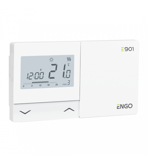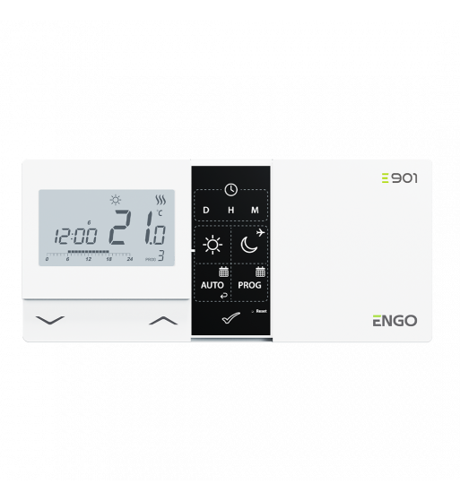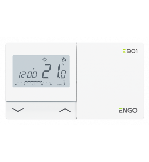 E901 este un regulator de cameră săptămânal, montat pe suprafața peretului, pentru controlul cu fir al dispozitivelor și sistemelor de încălzire sau răcire. Funcționarea sa constă în menținerea unor condiții confortabile în încăpere, conform cu grafice de funcționare sau cu temperatură constantă setată de utilizator. Acesta este conectat direct la dispozitivul de încălzire.