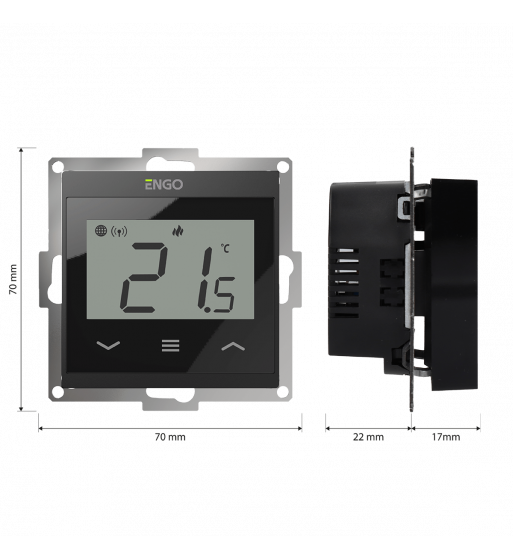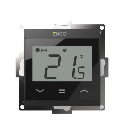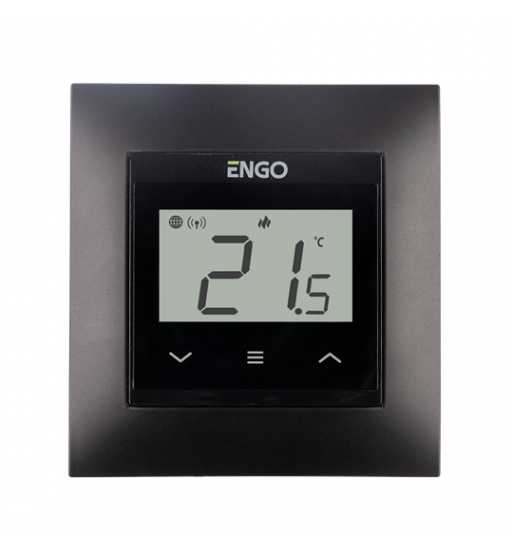 Regulator de temperatură încastrat pentru montarea într-un cadru de 55×55 mm. Conceput pentru controlul sistemelor de încălzire de suprafață plană, caracterizate printr-o inerție termică ridicată. De asemenea, poate controla orice alt tip de încălzire, precum și sistemele de răcire – în funcție de nevoile și setările utilizatorului. Modulul Wi-Fi încorporat permite instalarea și operarea ușoară a sistemului de încălzire prin intermediul aplicației mobile ENGO Smart.
